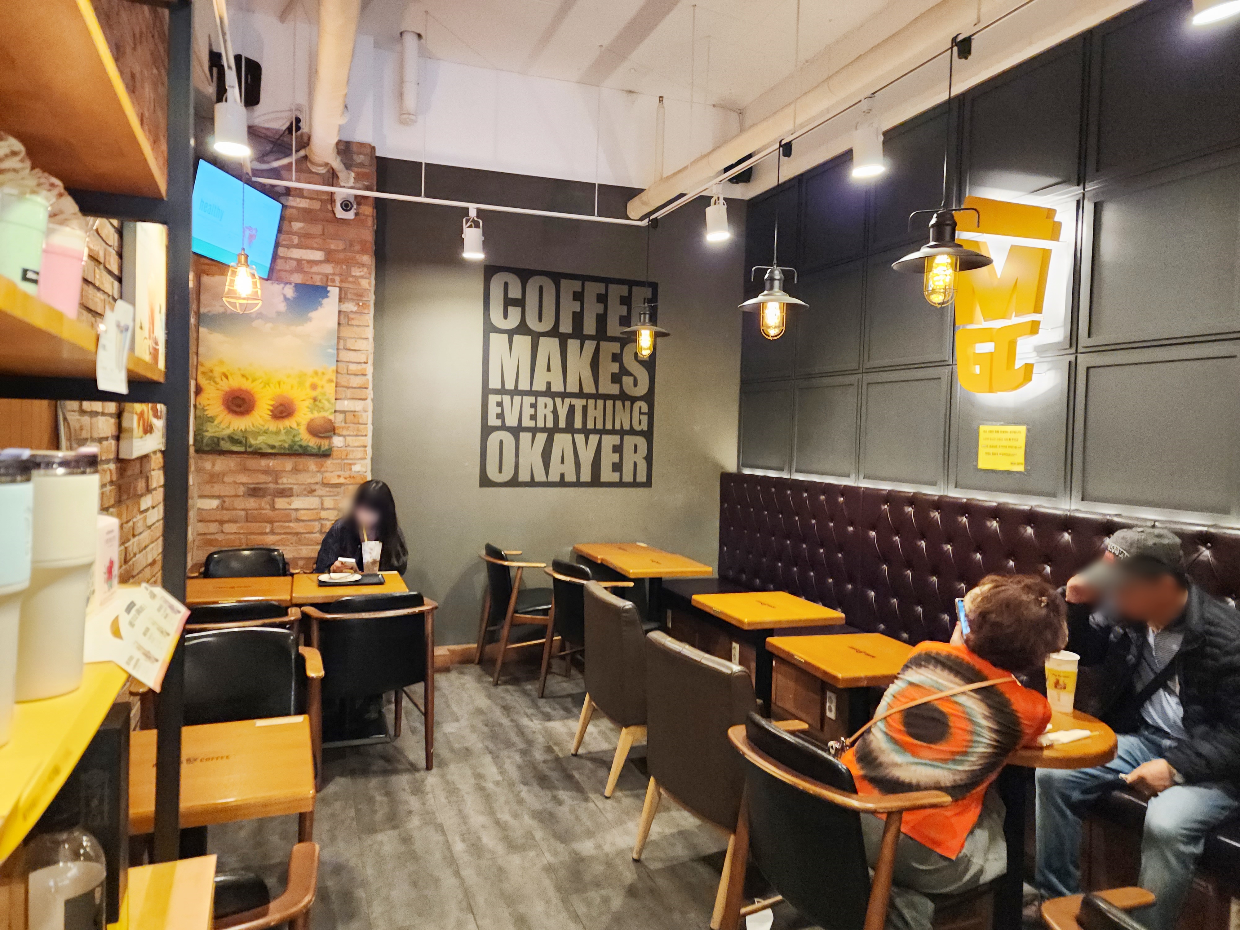 저가 커피 프랜차이즈 대부분이 테이크 아웃 전문 매장으로 홀이 거의 없는 경우가 많은데요. 메가MGC커피 수내로데오점에 들어서면 앉았다 쉬어가는 공간이 있습니다.